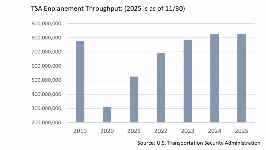 • There is a growing possibility of another government shutdown at the end of January 2026 should an agreement on the enhanced ACA subsidies fail to be reached. Another prolonged shutdown would negatively impact enplanement growth projections for FY26 given the expected shortage of TSA and air traffic controllers, with additional stresses likely should another government-mandated curtailment of activity at some of the most active airports materialize.