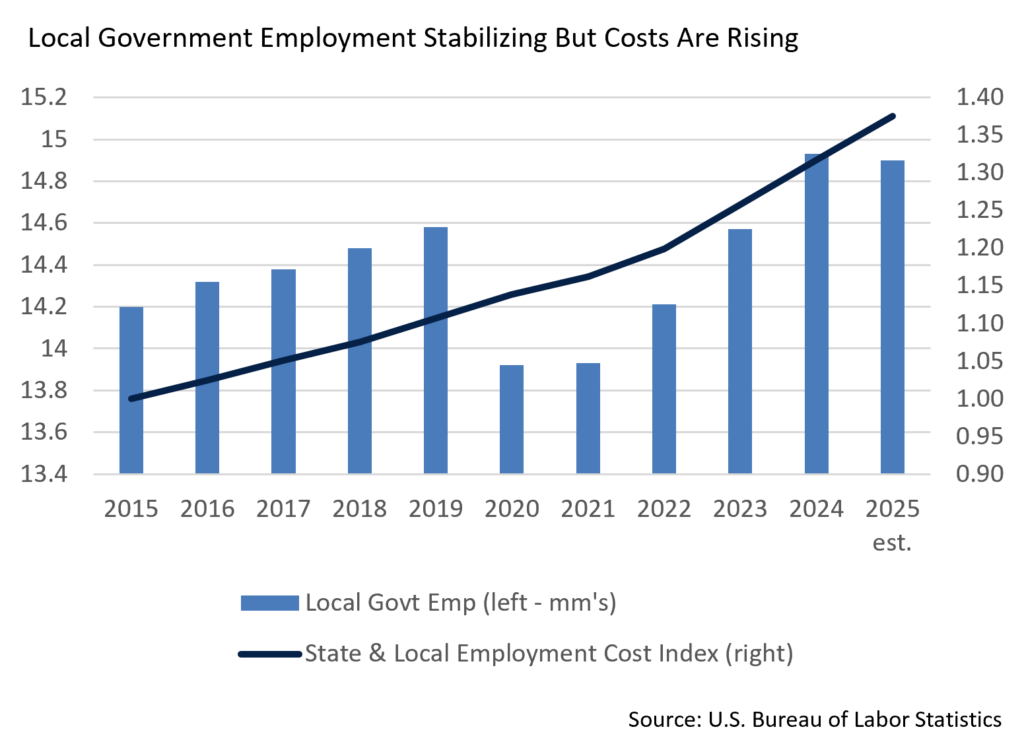 • A number of large cities incurred over budget public safety costs in 2024 and 2025. This presents a conundrum, as lower crime helps attract residents and businesses but may require a larger police force, the costs of which must be funded within each entity’s revenue raising ability. A balance must be struck, and we will be monitoring this expense item in 2026, as there are both economic and budget implications for cities.