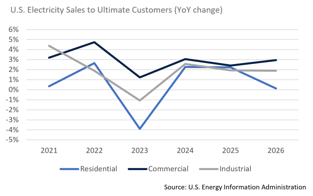 Sources: Energy Information Administration, “Henry Hub Natural Gas Spot Price”, December 2025; Deloitte, “2026 Power and Utilities Industry Outlook,” October 2025; S&P, “US Public Power and Electric Cooperative 2026 Outlook,” December 2025.