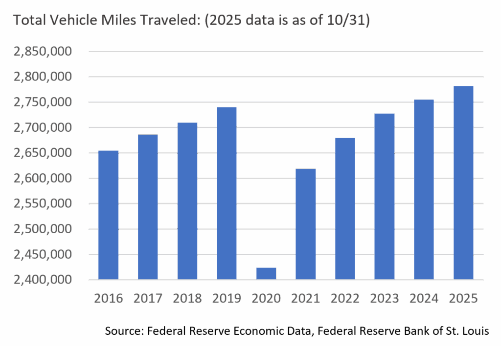 We are maintaining a “Stable” outlook for the Toll Road sector, with both revenue and transactions continuing their recent positive trends. Total vehicle miles traveled nationally maintained a steady growth trajectory through the first ten months of 2025, with mean annualized growth over the last three years at +1.3%, essentially in line with the pre-pandemic growth rate of +1.1%. Similarly modest growth is expected in 2026 given our expectation of economic expansion, with toll revenue growth faring better given a widespread commitment of management to increasing toll rates, with the majority of systems benefiting from programmatic CPI-linked increases.