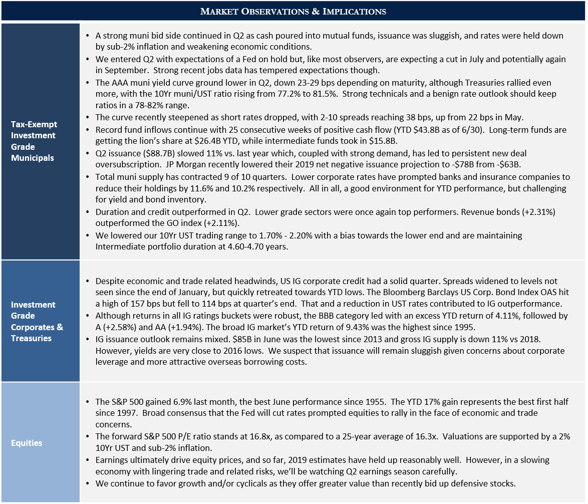 Ironically, the record high stock market is another source of unease. At present, valuations don’t look particularly stretched, with the S&P 500 finishing the quarter at a forward price-to-earnings ratio of 16.8x (per FactSet), well within historical norms. However, this is based on estimated earnings and is very sensitive to changes in corporate estimates. A decline of slightly more than 15% in earnings expectations would push that ratio over 20x, an extremely stretched valuation. Additionally, we note that for the last several years we’ve been in a “bad news is good news” market. Not by coincidence, the S&P 500 hit record highs the day the Fed hinted they would cut rates for the first time since the Great Recession, which is concerning considering a rate cut indicates the Fed believes the economy needs further stimulus to meet its dual mandate of price stability and full employment. For now, this seemingly odd market response is likely to merely limit upside, but eventually either good news must get good enough or bad news must get bad enough to change the market dynamic, causing at least some investor pain along the way.