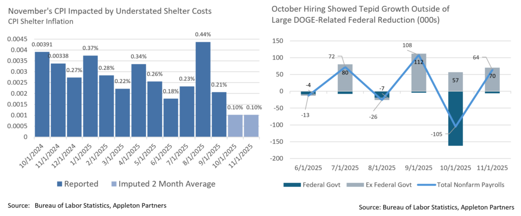 - Turning to inflation, while the CPI drop to +2.7% headline and +2.6% core looks like significant progress towards the Fed’s +2% objective, the reports’ details warrant caution. By our measure, 0.265 points of the 0.313-point improvement was related to a fall in shelter costs. Except, with BLS closed throughout October, no shelter cost survey was performed. As BLS protocol is to roll forward prior prices when data is missing, this effectively resulted in 0% shelter price inflation over October. While no two-month component price index was released, it’s possible to derive one from the rest of BLS’s published data, yielding a 0.203% increase. This is below the YTD one-month average, implying possible November impacts as well. As shelter inflation is based on a six-month sample, this component will be understated through at least April even without a second shutdown, and with a January 30th stopgap deadline, that’s far from certain. We believe a focus on ex-shelter measures like the Fed’s “Supercore” will become even more important in the first half of 2026 to make sense of inflation data.
