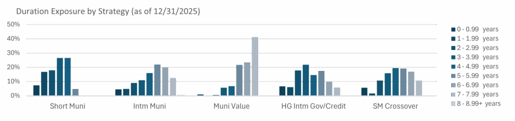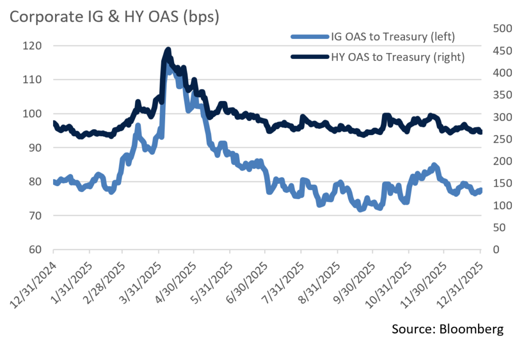 - While IG spreads began to move wider in November, they stayed in check over the course of December. The 80bps OAS recorded on the Bloomberg US Corporate Index only fell to 78bps to close out the year. That’s also just 2bps off where we began 2025. Looking back, the 119bps OAS of “liberation day” aftermath proved to be a short-lived anomaly. 2025’s average OAS was only 84bps, and the 72bps OAS print on September 19th was the lowest seen in at least 10 years. We could see some spread widening in 2026, especially if record setting issuance puts pressure on buyers and fatigue sets in. However, we don’t anticipate significant widening given the credit strength of issuers and the demand for yield and feel that IG spreads should remain in a comfortable range over the near term.