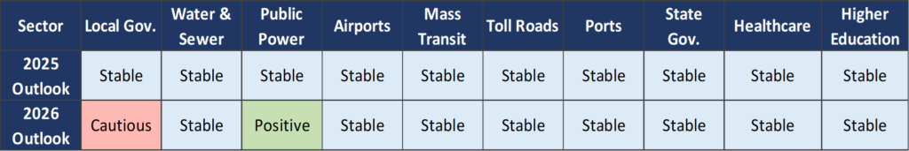 The commentary below highlights the two sectors that have had a 2026 outlook change, Local Government and Public Power.
