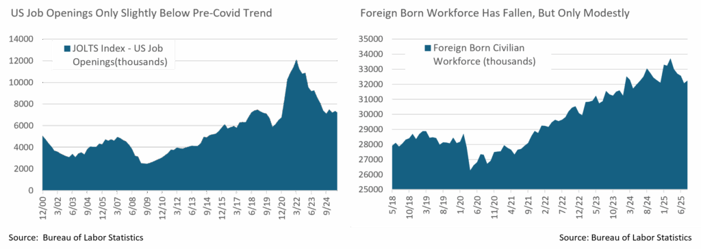 - What’s interesting is that it’s now even harder to align this strong growth with anemic hiring. A federal government shutdown meant we did not get a September Nonfarm Payrolls report at the start of October, but the most up-to-date data shows barely positive hiring over the late spring and summer. The two leading theories for this are that a sharp reversal in immigration trends means very few new jobs are needed to maintain full employment, or that AI is boosting productivity so significantly that companies don’t need to hire. Jobs opening data suggests worker demand is perhaps slightly below the pre-covid trendline, and the foreign-born workforce has fallen somewhat, but neither is conclusive. Given this, we don’t have the full picture yet, and in all cases, the disconnect between growth and hiring bears watching.