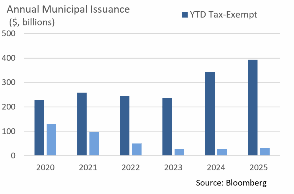 - According to JP Morgan, September gross issuance totaled $47B, modestly below August’s $48B. This exceeded the 5-year average of $40B by 18%, with tax-exempt supply coming in at $44B, also solidly ahead of pace relative to the 5-year average. This brings the YTD gross supply to $424B, while the tax-exempt issuance total is $393B, ahead of last year by 15%. Expectations are for issuance to continue to outpace that of 2024 through the end of the year, with some dealers upsizing their beginning of the year issuance calls.