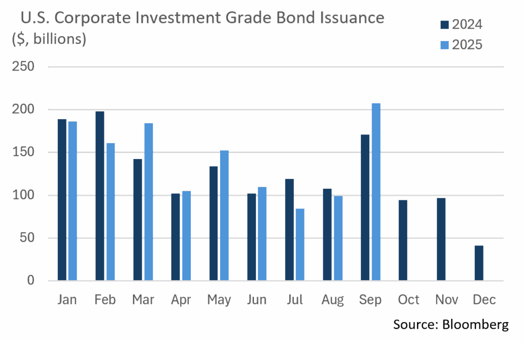 - Amid this positive technical backdrop, issuers are taking full advantage of continued demand. The $207.5 billion in issuance in September makes it the largest month of the year, the largest September overall, and the 5th largest month on record. This September’s primary market was strong, and we are on track to reach the YTD target and may possibly surpass it. Given some of the headline news at times, we have seen concessions on new deals at low levels and order books that are several times higher than bonds that are available. Expectations for new debt in October are roughly $90 billion, but this momentum could shatter that number.