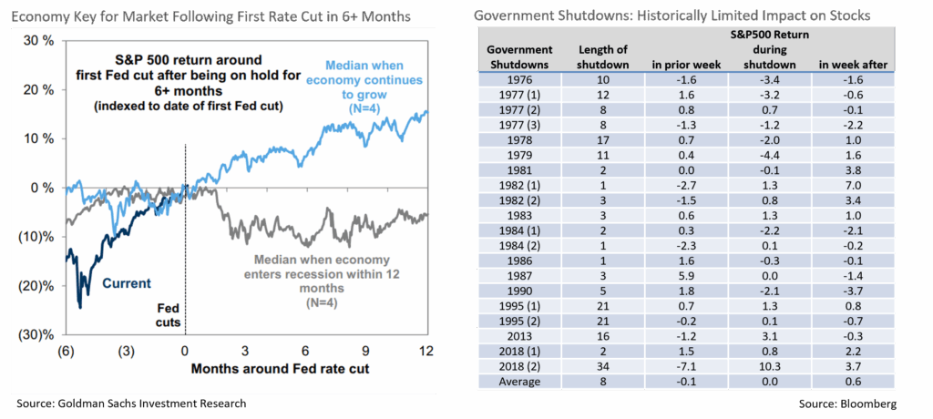 • As we move into early October, a risk worth watching is the government shutdown, which began at midnight on Oct 1 and continues as of this writing. Ironically, the threat of government job cuts is likely to further fuel the expectations for further Fed rate cuts, providing a potential lift for risk assets. We will be monitoring the situation closely, as it likely lasts longer than the historical average of 8 days. Away from the shutdown, we remain constructive on equities and would use any volatility or weakness to add to positioning. As shown below, government shutdowns tend to be relative “non-events” with little impact on financial markets in the longer-term.